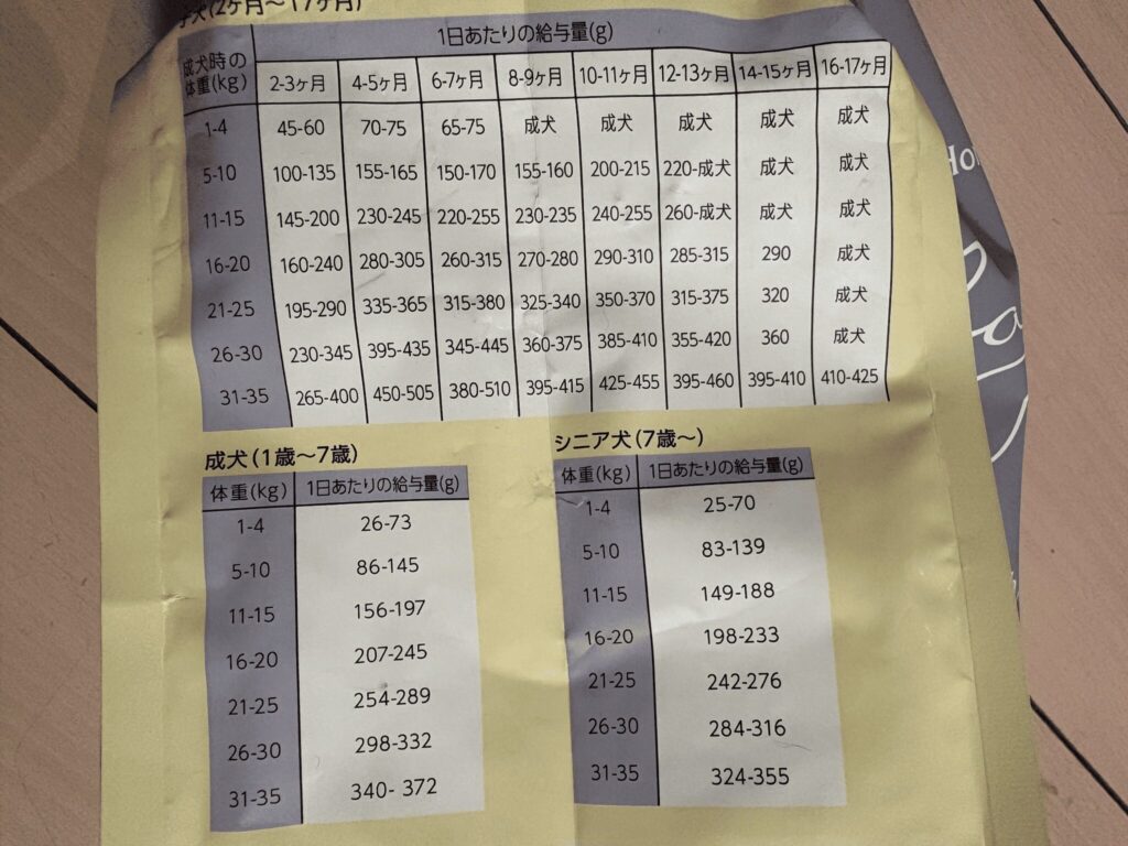 ただし、給餌量は犬種や体の大きさによって大きく異なるため、必ず愛犬の体重に合った量を与えるようにしてください。