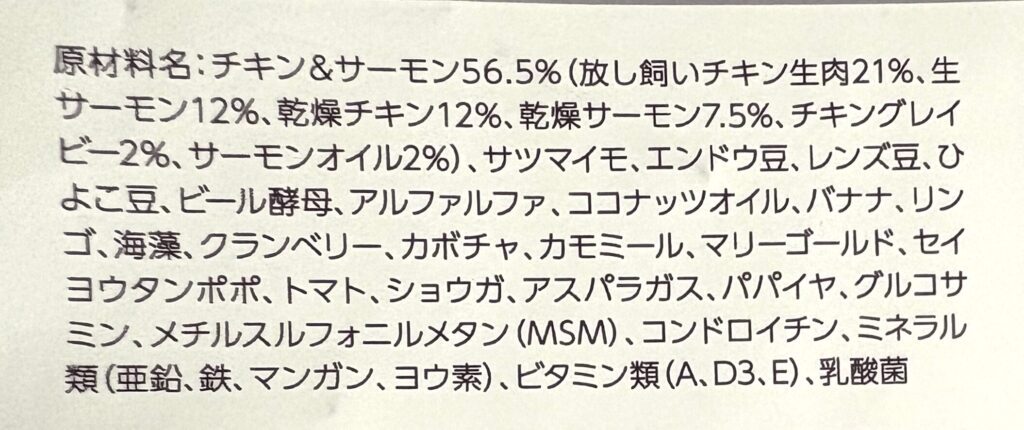 原材料チキン&サーモン:チキン&サーモン56.5%マグロ&白身魚:マグロ&白身魚50%